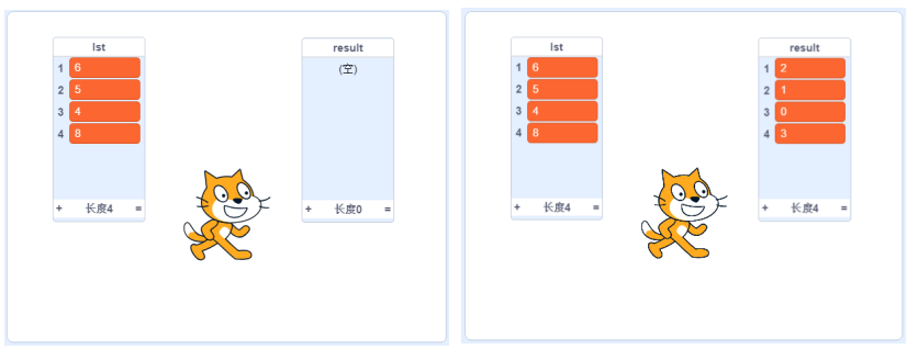 <p>CCF GESP认证Scratch图形化四级编程题:有多少小于当前元素的数字</p><p><img src="https://img.julecn.com/tk/kyb/cnhowclqtnbbvkta.png" alt=""></p><p>【题目描述】</p><p>默认小猫角色和白色背景。给你一个列表“lst”,对于其中每个元素,请你统计列表中比它小的所有数字的个数并存入到另一个列表“result”中。</p><p>比如:lst = [6, 5, 4, 8</p><p>]对于第一个元素 6,有 2 个比它小的数字:(5,4)。</p><p>对于第二个元素 5,有 1 个比它小的数字:(4)。</p><p>对于第三个元素 4,有 0 个比它小的数字:()。</p><p>对于第四个元素 8,有 3 个比它小的数字:(6,5,4)。</p><p>最后得到 result = [2, 1, 0, 3]</p><p>【输入描述】</p><p>新建列表“lst”,用于存储原始的数据。</p><p>如下图所示:</p><p><img src="https://img.julecn.com/tk/lri/yetzcauqgbxtweex.png" alt=""></p><p>【输出描述】</p><p>新建列表“result”,用于存储得到的结果。</p><p>如下图所示:</p><p><img src="https://img.julecn.com/tk/pva/rxoyoyoypknnkxlq.png" alt=""></p><p>【输入样例】</p><p>lst = [6, 5, 4, 8]</p><p>【输出样例】</p><p>result = [2, 1, 0, 3]</p><p>【输入样例】</p><p>lst = [7, 7, 7, 7, 7]</p><p>【输出样例】</p><p>result = [0, 0, 0, 0, 0]</p><p><span style="color: #FF0000;">注意:</span></p><ol class=" list-paddingleft-2" style="list-style-type: decimal;"><li><p><span style="color: #FF0000;"> 变量名的拼写(包括大小写)要和题目完全一致。</span></p></li><li><p><span style="color: #FF0000;">输入变量直接赋值即可,无需使用“询问并等待”积木块。 </span><br></p></li></ol>