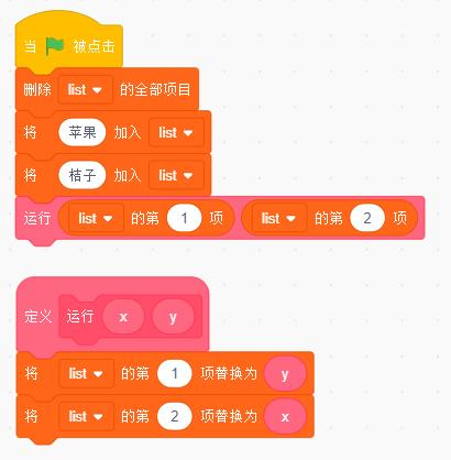 默认小猫角色执行给定程序,列表list的前两项为桔子、桔子