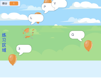 程序要求: 1、源源不断的字母气球和数字气球从上方随机位置落下; 2、到达练习区域,按下对应的按键气球就会破碎;完全离开练习区域(漏掉)也会破碎; 3、制作得分系统,在练习区域打碎个气球就会得1分;漏掉一个气球扣1分;得分到达30分挑战成功; 4、挑战成功之后有胜利标志,程序全部停止。