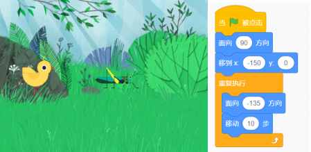 小鸡初始位置和Scratch程序如下图所示: