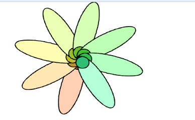 2. 功能实现 (1)按下数字5清空屏幕,移到随机位置,画出5个花瓣的花; (2)按下数字6清空屏幕,移到随机位置,画出6个花瓣的花; (3)按下数字8清空屏幕,移到随机位置,画出8个花瓣的花; (4)需要绘制花心,如上图所示; (5)花瓣的颜色不相同; (6)按下数字0清空屏幕。