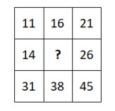 <img src="https://img.julecn.com/tk/rzs/khobwkjvvziecbwt.png" alt="3×3数字九宫格,第一行依次为11、16、21,第二行依次为14、?、26,第三行依次为31、38、45">