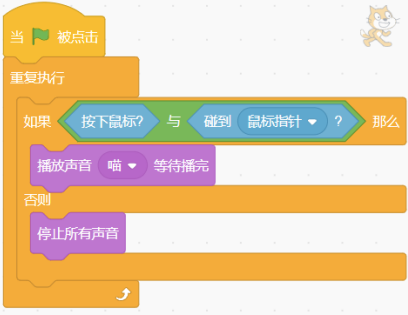 <img src="https://img.julecn.com/tk/vmr/mzqqmepirksapcga.png" alt="Scratch程序积木截图:当绿旗被点击,进入重复执行循环;如果同时满足「按下鼠标?」与「碰到鼠标指针」条件,那么播放声音「喵」等待播完;否则停止所有声音">