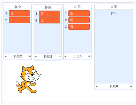 默认小猫角色,列表“杯身”存储黑白两种颜色,“杯盖”存储蓝红两种颜色,“杯带”存储紫粉黄三种颜色,保存方案格式为杯身颜色+杯盖颜色+杯带颜色,如“白红黄”。<img src="https://img.julecn.com/tk/kpy/qnnhvfniufubawwi.png" alt=""><img src="https://img.julecn.com/tk/yoc/adchnzdxoniuaryy.png" alt="">