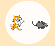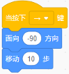 Scratch小猫和老鼠的初始位置如下图所示,对应的程序积木为:当按下→键时,小猫面向-90方向并移动10步。