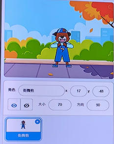 【Scratch编程实现】 点击小绿旗后,舞台上会响起音乐,街舞熊开始在街上跳舞,音乐结束后停止跳舞,掌声响起。