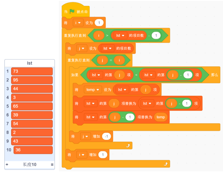 默认小猫角色,scratch执行下列程序,可以将列表“lst”中的数据由小到大排序。<img src="https://img.julecn.com/tk/cqp/yqfcshvwmlggtmzp.png" alt="">