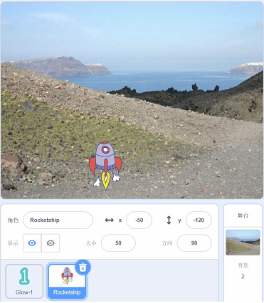 点击绿旗,角色 Rocketship 的初始位置为(X=-50,Y=-120),初始方向为90°,初始大小为50,初始造型为rocketship-a。