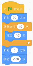 <img src="https://img.julecn.com/tk/vfi/sgvzxndbjxlnchxe.png" alt="Scratch程序块:当绿旗被点击,面向90方向,重复执行10次移动10步,之后面向0方向,移动-100步">