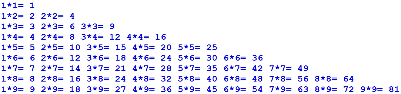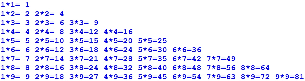 for i in range(1, 10): for j in range(1, i + 1): print(f"{j}*{i}= {i*j}", end=" ") print()