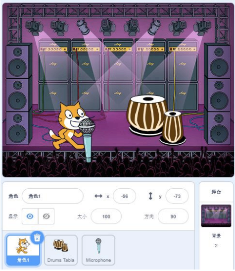 角色与舞台背景和小猫程序如下图所示:
