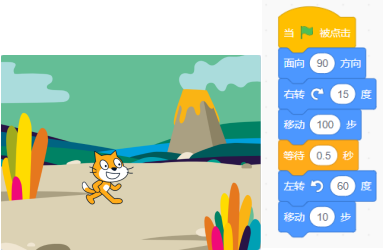 Scratch小猫初始状态如下图所示,请根据右侧的积木代码计算点击绿旗后小猫最终面向的方向角度。<img src="https://img.julecn.com/tk/enj/iadpgservtncbhqu.png" alt="">