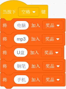 <img src="https://img.julecn.com/tk/lxo/foqqlfyetcidxnjp.png" alt="Scratch程序截图:按下空格键时,依次将电脑、mp3、U盘、钢笔、手机追加到奖品列表中">