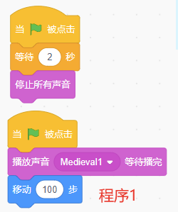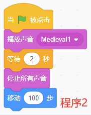 声音Medieval1的长度是9.68秒,Scratch运行下列程序1或程序2,都能实现播放声音2秒后,声音停止,角色移动100步。<img src="https://img.julecn.com/tk/qvx/csgprnkdztgoyuhj.png" alt="程序1"><img src="https://img.julecn.com/tk/uyl/cjwpoaxrtyqlbxjt.png" alt="程序2">