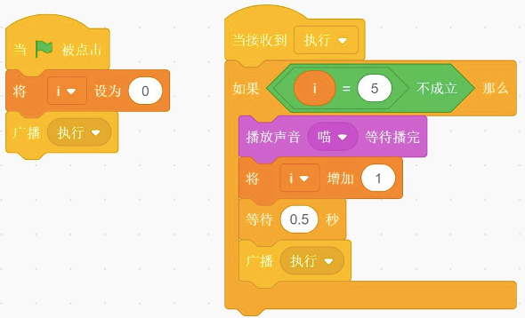小猫每“喵”叫一次,变量i增加1,变量i为5后停止。