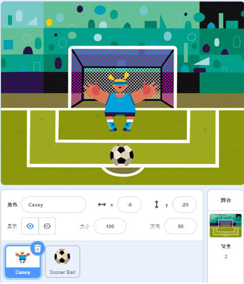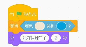 足球会随着鼠标指针在舞台上移动,碰到守门员后会暂停2秒。